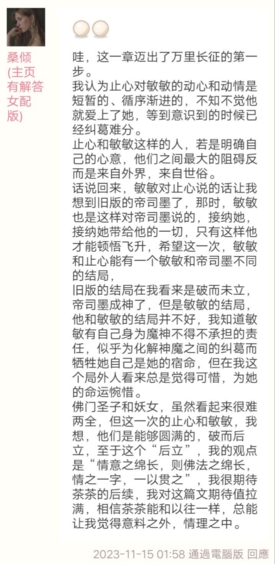 佛门圣子和妖女,虽然看起来很难两全,但这一次的止心和敏敏,我想,他们是能够圆满的,破而后立,至于这个“后立”,我的观点是“情意之绵长则佛法之绵长,情之一字,一以贯之”我很期待茶茶的后续,我对这篇文期待值拉满,相信茶茶能和以往一样总能让我觉得意料之外情理之中。